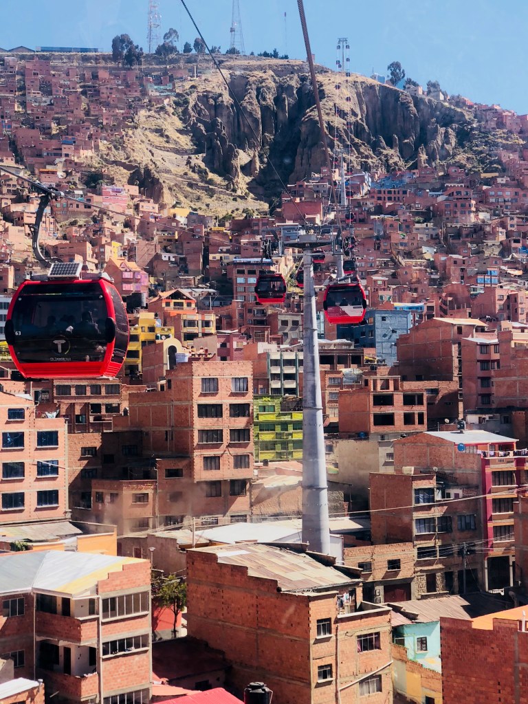A must see experience while in La Paz is the Mi Teleférico–an aerial cable car urban transport system that serves the La Paz-El Alto metropolitan area. These modern gondolas were built in 2014, and the system now includes twenty-five stations on eight lines. Each of the lines is color coded, making it easier for the local residents to identify, and they transport working class residents, and tourists, from the city center up into the hillsides and the El Alto–the separate, working class city that sits high above the La Paz city centre.